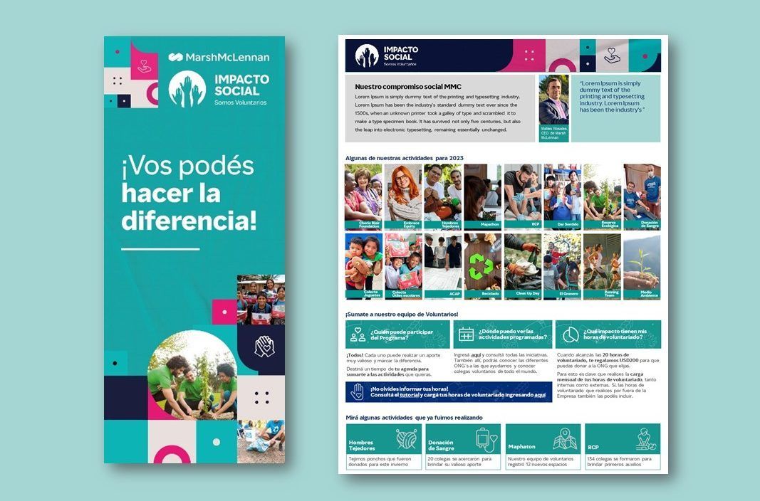 Una de las campañas de comunicación trabajadas con nuestro cliente Marsh McLennan fue la vinculada a «Impacto Social», con el desafío de inspirar a los colaboradores a marcar la diferencia en la comunidad, contribuyendo activa y positivamente mediante su participación en las diferentes actividades voluntarias organizadas por la compañía.